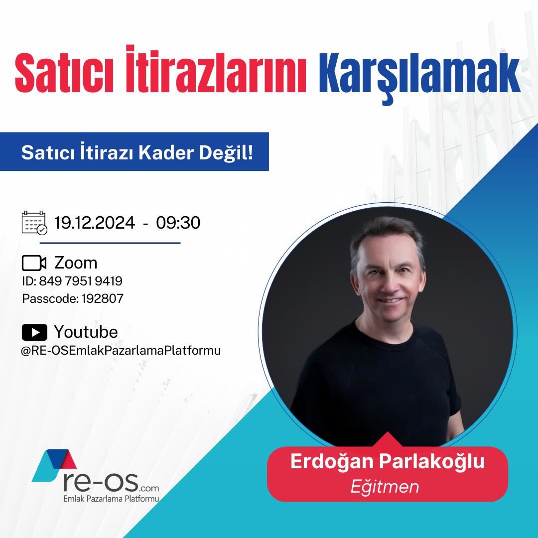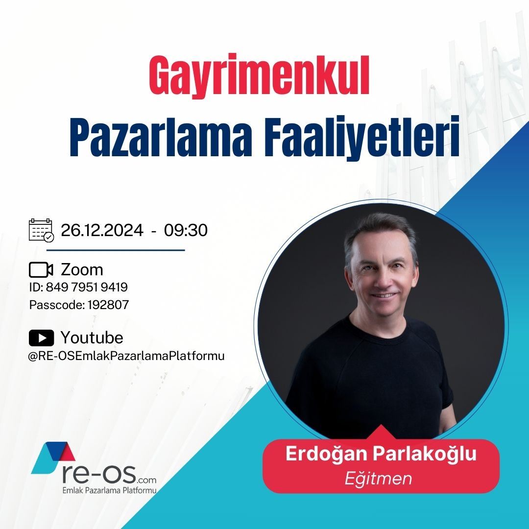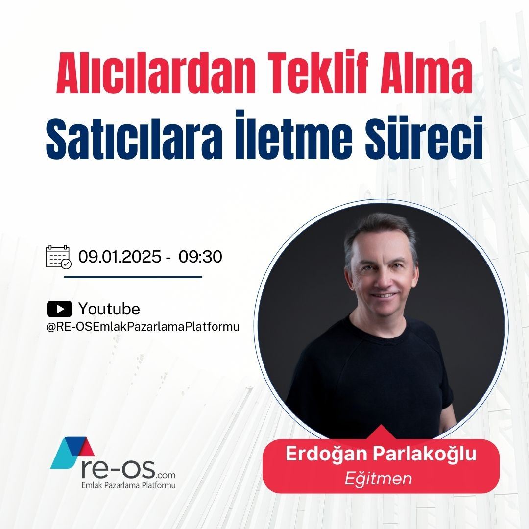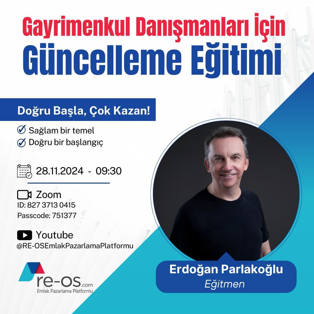 28 Kasım 2024 Perşembe, saat 09:30’da gayrimenkul danışmanlığı alanında uzun yıllardır aktif yöneticilik yapan ve markalara çok sayıda eğitimler vermiş Sn. Erdoğan PARLAKOĞLU, RE-OS.com eğitim seriler...