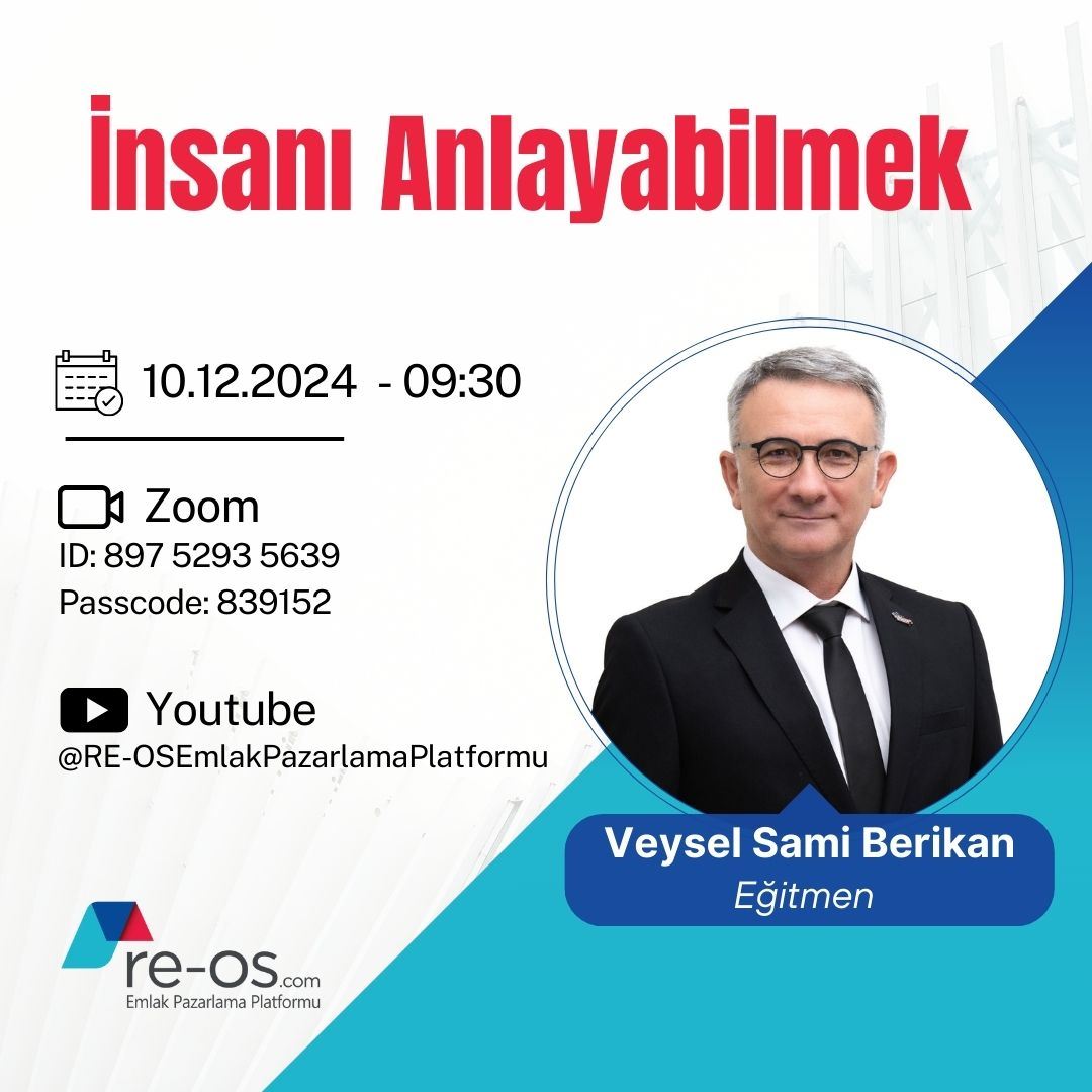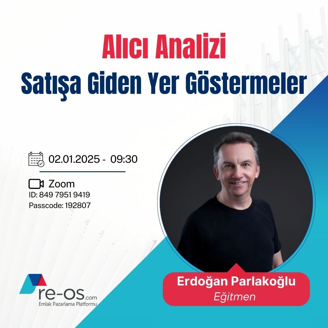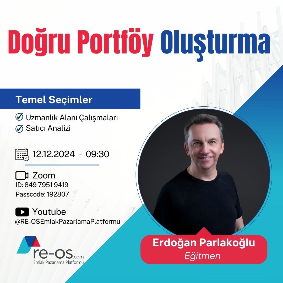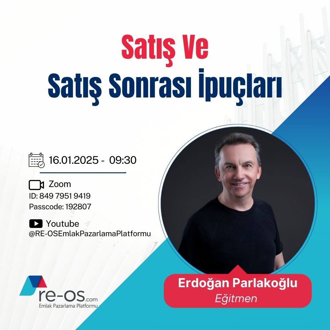 28 Kasım 2024 Perşembe, saat 09:30’da gayrimenkul danışmanlığı alanında uzun yıllardır aktif yöneticilik yapan ve markalara çok sayıda eğitimler vermiş Sn. Erdoğan PARLAKOĞLU, RE-OS.com eğitim seriler...